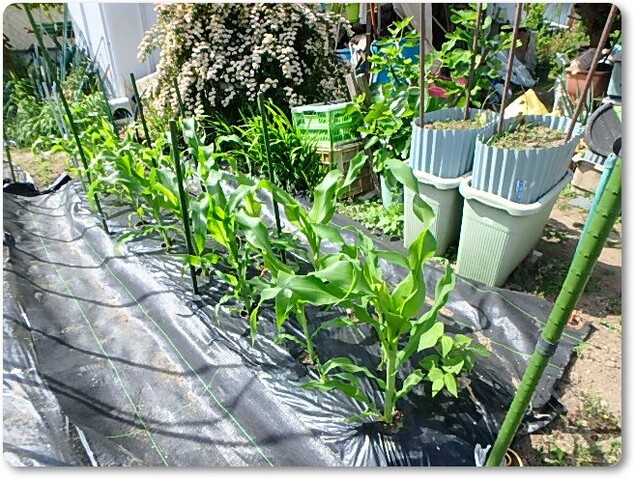 1作目のトウモロコシの背丈が伸びてきたので、転倒防止柵をと周りに支柱を打ち込む。