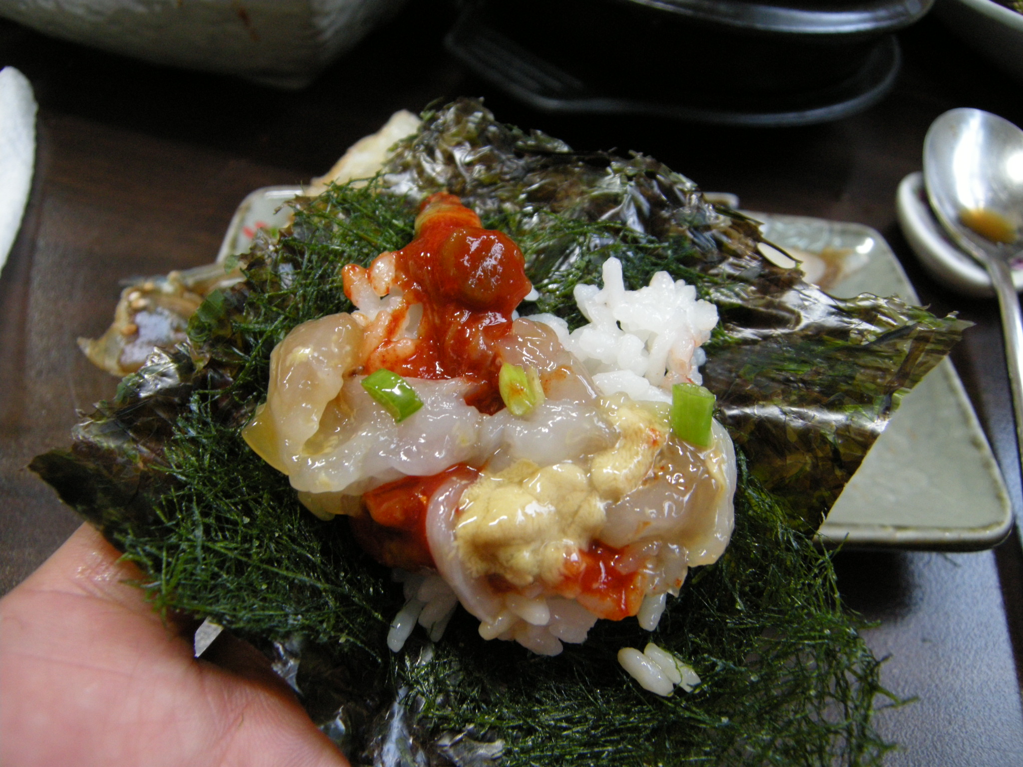 食感の違う2種類の海苔の上にご飯を乗せ、その上にトロトロのカニ味噌、カニ身、牡蠣のキムチを乗せて頂きます。絶妙〜〜〜です。