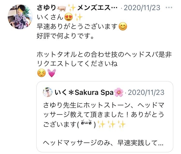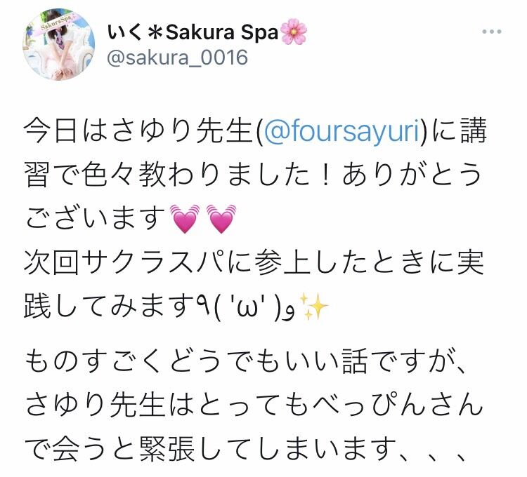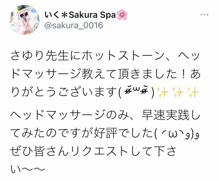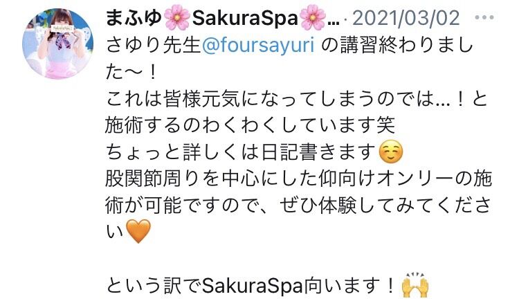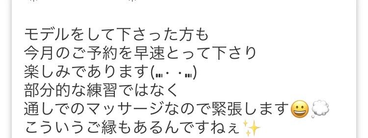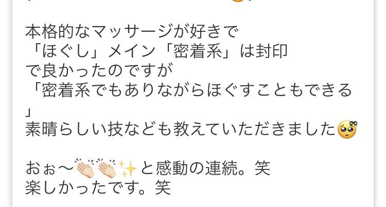 2021年03月23日 ↓↓講習の感想&口コミ①↓↓ 講習依頼について、〇2時間1万円~(男性モデル有)〇講習ルーム有(新宿・御徒町)出張もOK!〇キャンセルポリシー 当日でも5時間前までご連絡頂ければOK!今まで講習を受けて頂いたセラピストさんの感想等まとめさせて頂きました。まだまだありますので、時間をみつけては更新していきます。◎フォーシーズン みほさん (2回受講)◎サクラスパ まふゆさん (3回受講)◎サクラスパ いくさん(3回受講) カテゴリなしの他の記事 < 前の記事 コメント このブログにコメントするにはログインが必要です。 さんログアウト この記事には許可ユーザしかコメントができません。 コメントフォーム 名前 コメント 評価する リセット リセット 顔 星 投稿する 情報を記憶