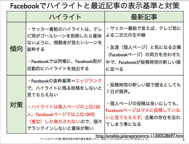 すべてを表示するのではなく、すべての中から見た方がいいものだけを表示するのがハイライトの機能である。いつもの傾向を記憶し、いつもイイネしている人や企業の投稿だけが表示される。そのため同じ人をフォローしていても表示されるものは人によって違う。