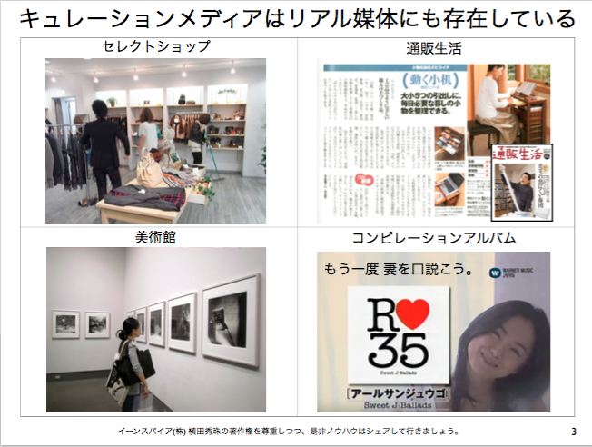 キュレーションとは、情報を取捨選択してまとめることである。「つながる」ことに価値があるという考え方。