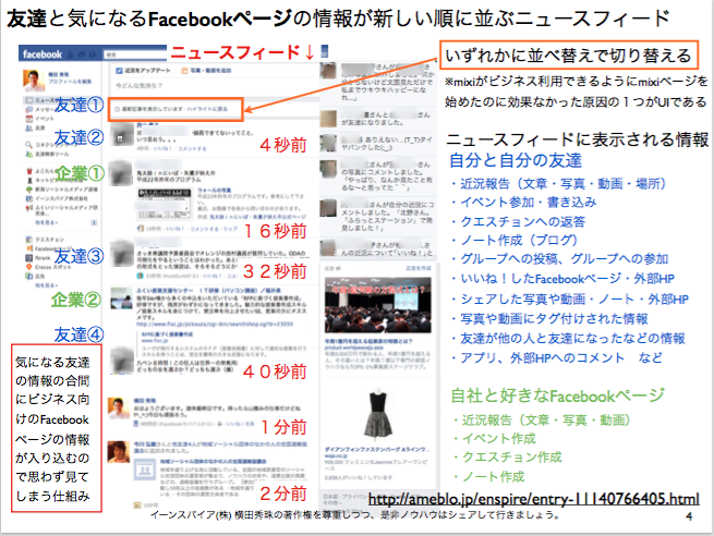 Twitterはタイムラインに全て表示されるので情報の流れが速くて大変だが、Facebookはニュースフェードの並び替えができる。