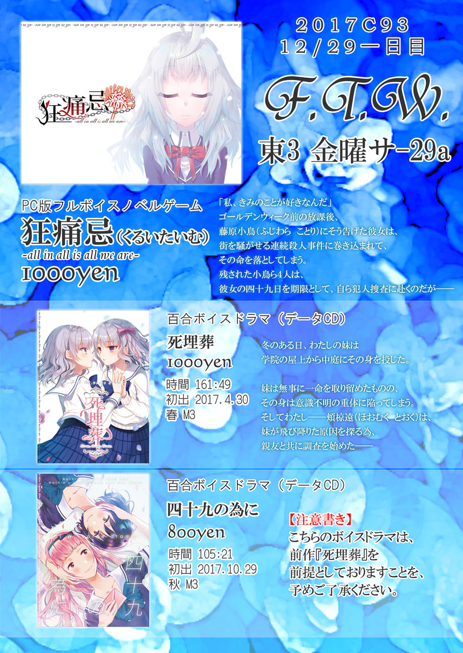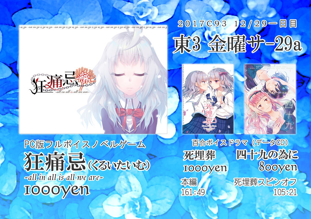 頒布物のPC版『狂痛忌』、百合ボイスドラマ『死埋葬』『四十九の為に』がすべて完売し、無料配布のポストカードの方もご用意させて頂いた分すべてお受け取り頂き、誠に感謝しております。