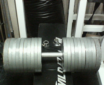 商品の紹介文には明記されていなかったですが、10キロのプレートをフルにつけた場合145キロのダンベルになります。また、20キロのプレートを使用した場合245キロの巨大ダンベルの出来上がりでございます(^^