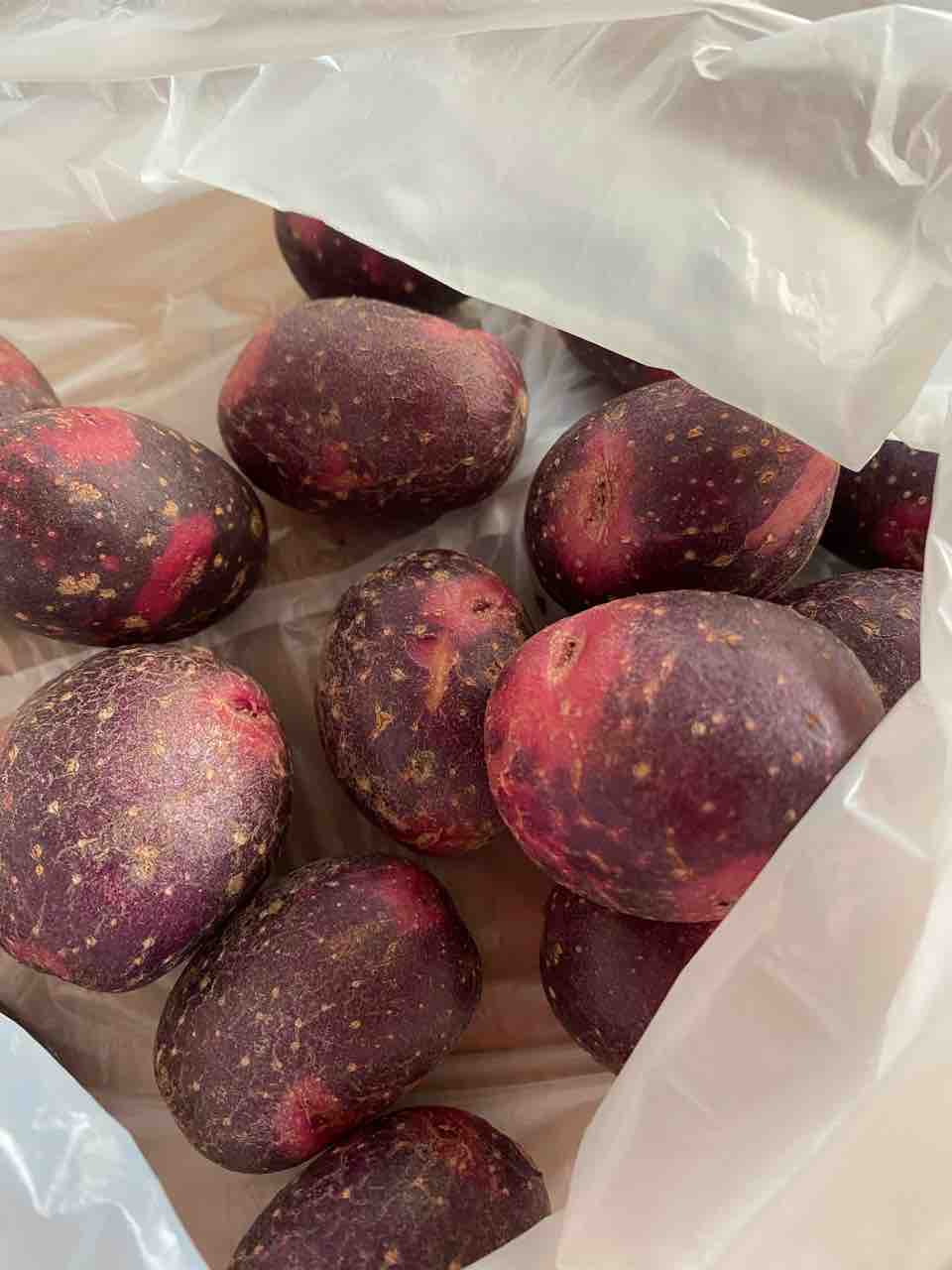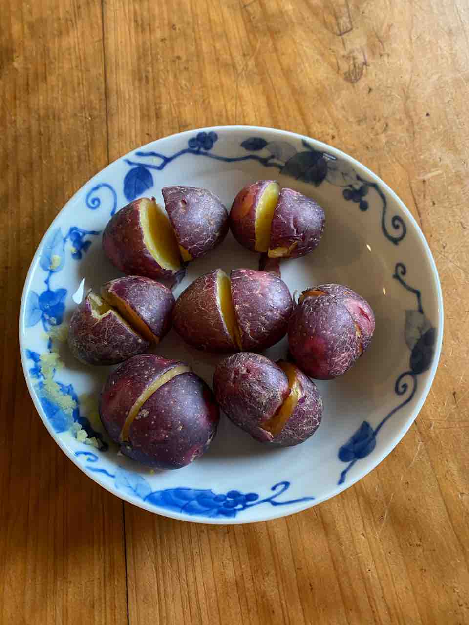 2020年05月27日 新じゃがの季節 新じゃがの季節ですね。メークインと男爵は、よく使うじゃがいもです。日曜日に、デスクロイヤという珍しいじゃがいもの採りたてをもらいました。じゃがいもの皮が紫色で、目が赤いためマスクをかぶったような外観ということから登録出願時に名づけた「デストロイヤ」が通称名となったそうです。愛らしい。レンジで、温めて、油で、揚げるとおいしいよ。と教えてくれました。素材そのものが、おいしいです。