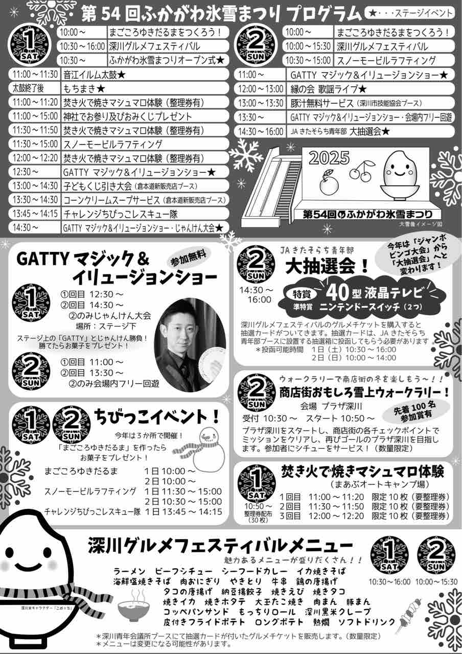 昨年同様深川市出身のGATTYさんによるマジック&イリュージョンショーや、豪華景品の当たる大抽選会など今回も楽しみなものばかりの内容となっております!