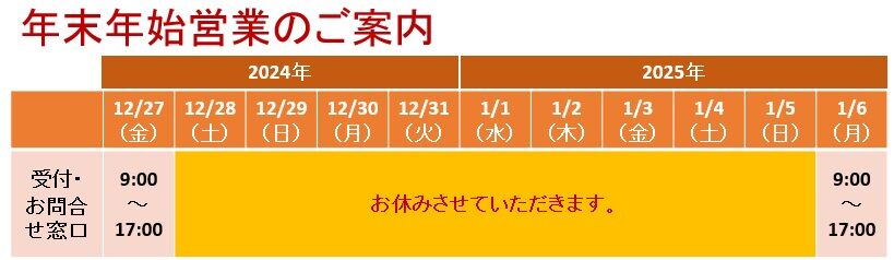 2024年12月04日 年末年始営業のご案内 年末年始の休業日を以下の通りお知らせいたします。2025年1月6日(月)より営業を通常通り開始いたします。 「お知らせ」カテゴリの最新記事 < 前の記事次の記事 >
