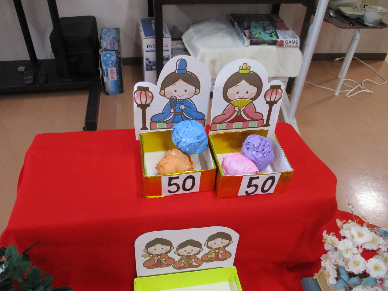 と、いうわけで今年は趣向を変えてひな祭りゲーム大会に!まあ、見ておわかりの通り玉入れなんですけどね(笑)