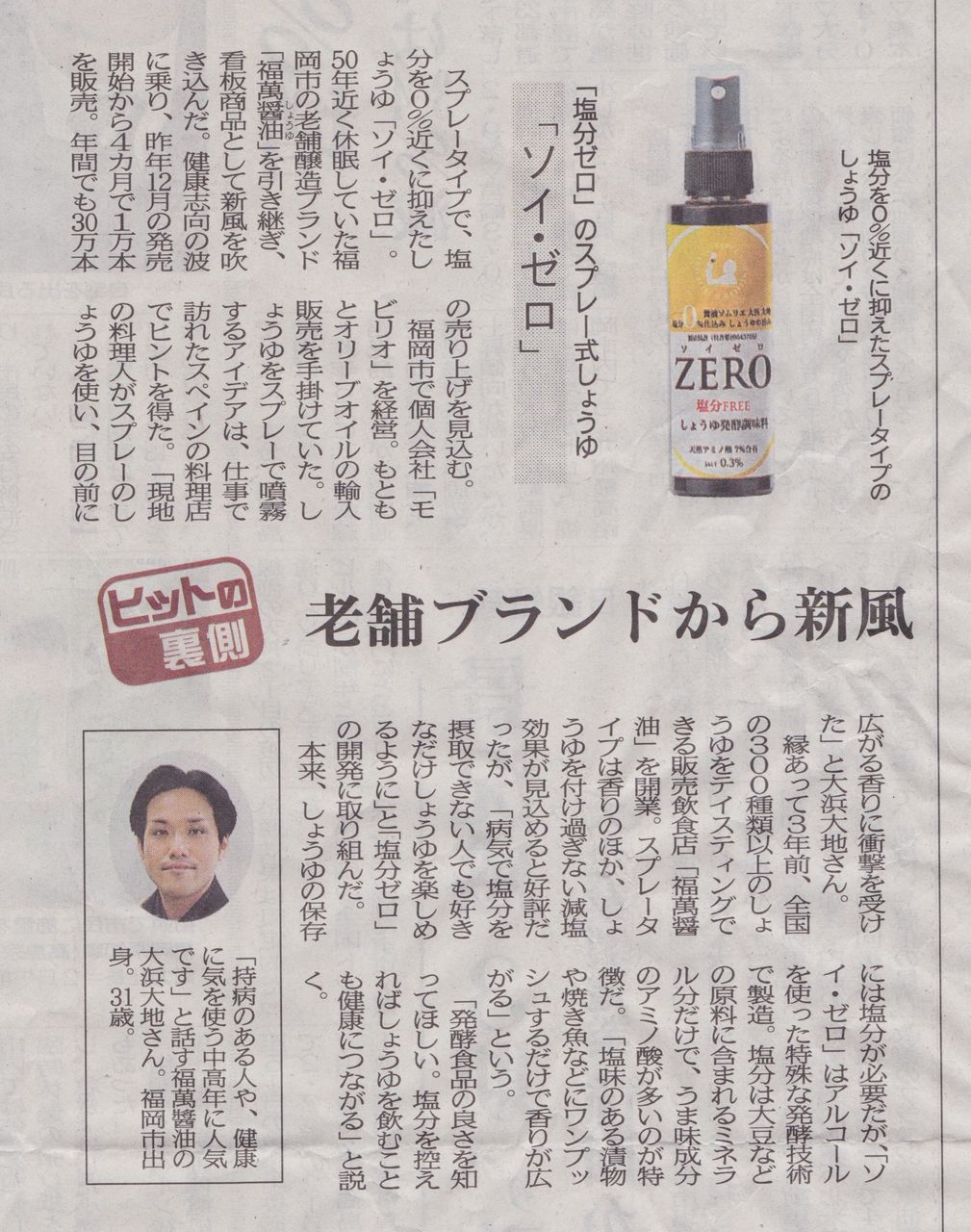 スプレータイプで、塩分を0%近くに抑えたしょうゆ「ソイ・ゼロ」。50年近く休眠していた福岡市の老舗醸造ブランド「福萬(ふくまん)醤油(しょうゆ)」を引き継ぎ、看板商品として新風を吹き込んだ。健康志向の波に乗り、昨年12月の発売開始から4カ月で1万本を販売。年間でも30万本の売り上げを見込む。