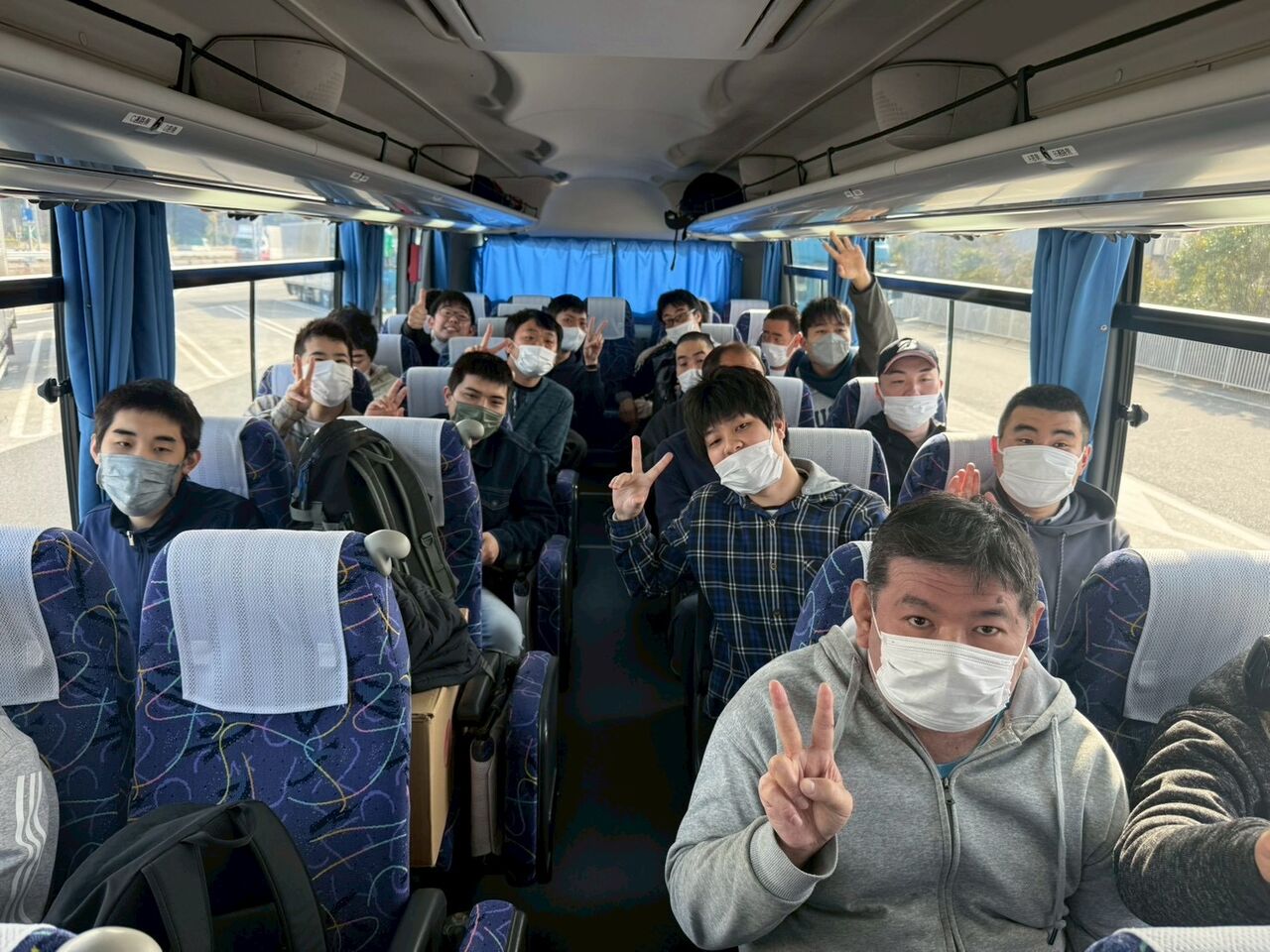 朝ご家族に見送られながら出発したバスの中はこれから向かう鉄道博物館にワクワクと