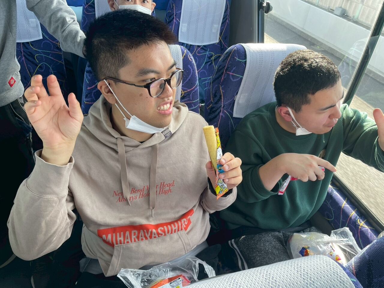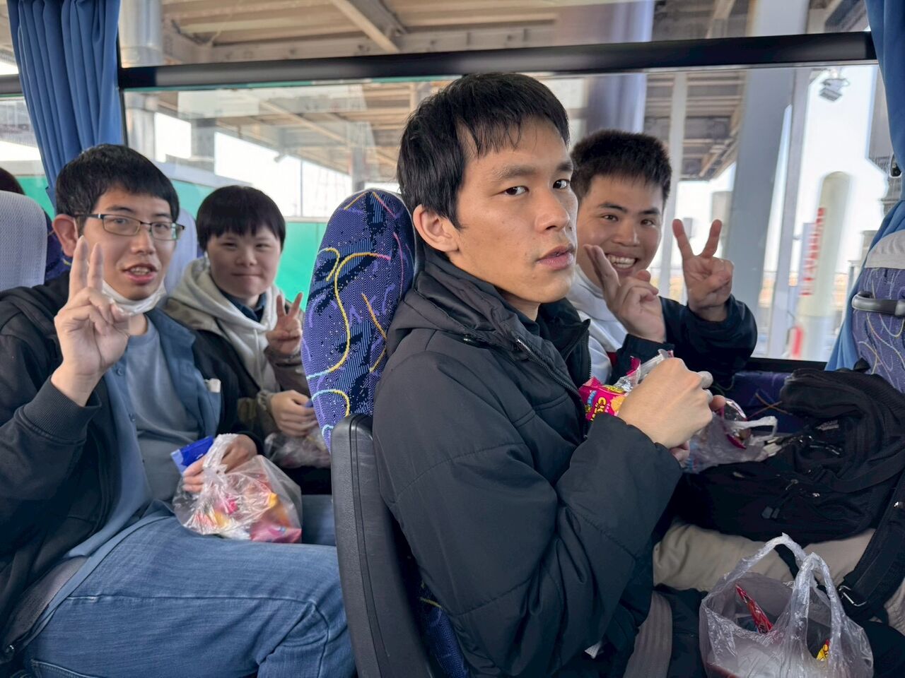 車内から見える景色を見て楽しんだり、家族会からいただいたお菓子の詰め合わせや