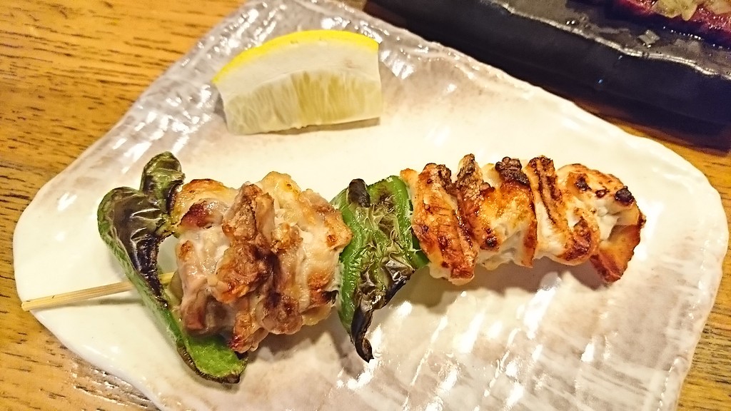 値段だけの事はあり、なかなか大きな串で、軍鶏肉の間にはピーマンが挟まれる。