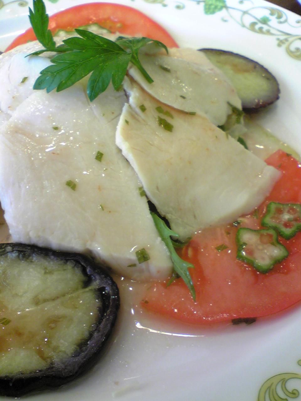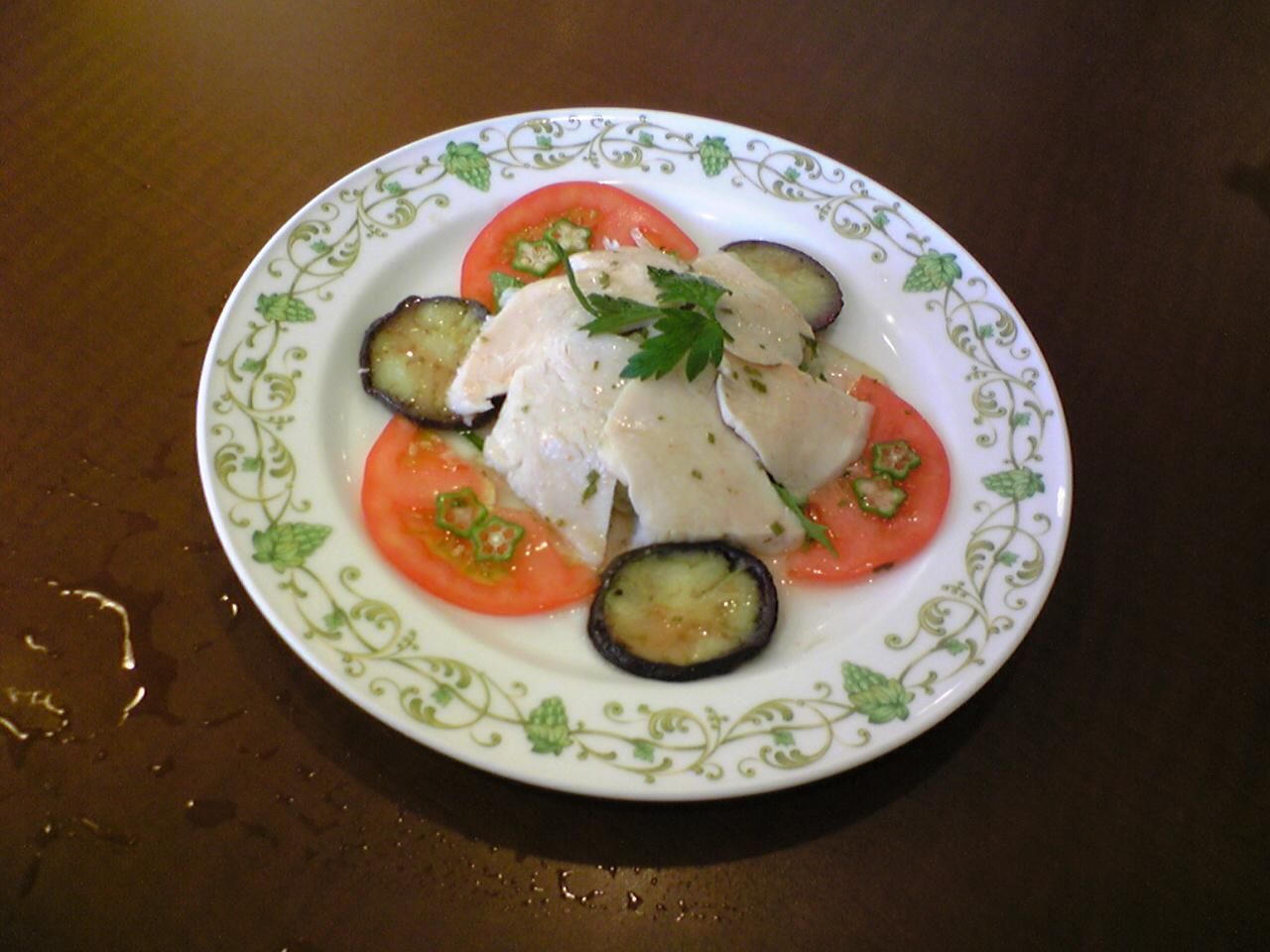 鶏胸肉を蒸し、薄く削ぎ切りにした物と、夏野菜を梅肉ソースでさっぱりと食す一皿。