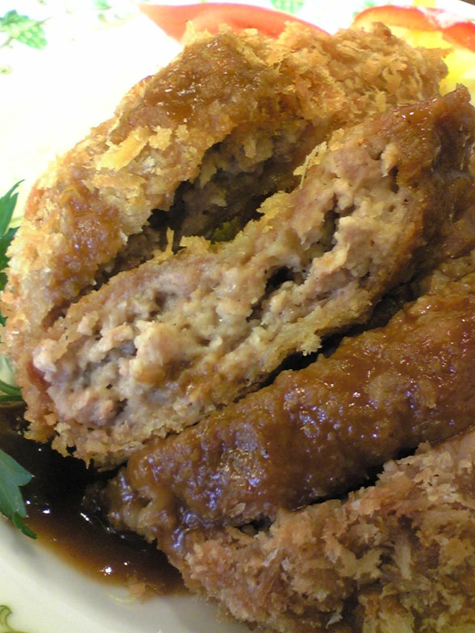 次に、デミグラスソースの味わいが口中に拡がり、そこにジューシーな肉餡から溢れ出すたっぷりの肉汁が混じり込む。咀嚼する度、口中一杯に、肉餡から溢れ出る肉汁とデミグラスソースが交じり合い、肉餡と混じりながら混沌として拡がってゆく。