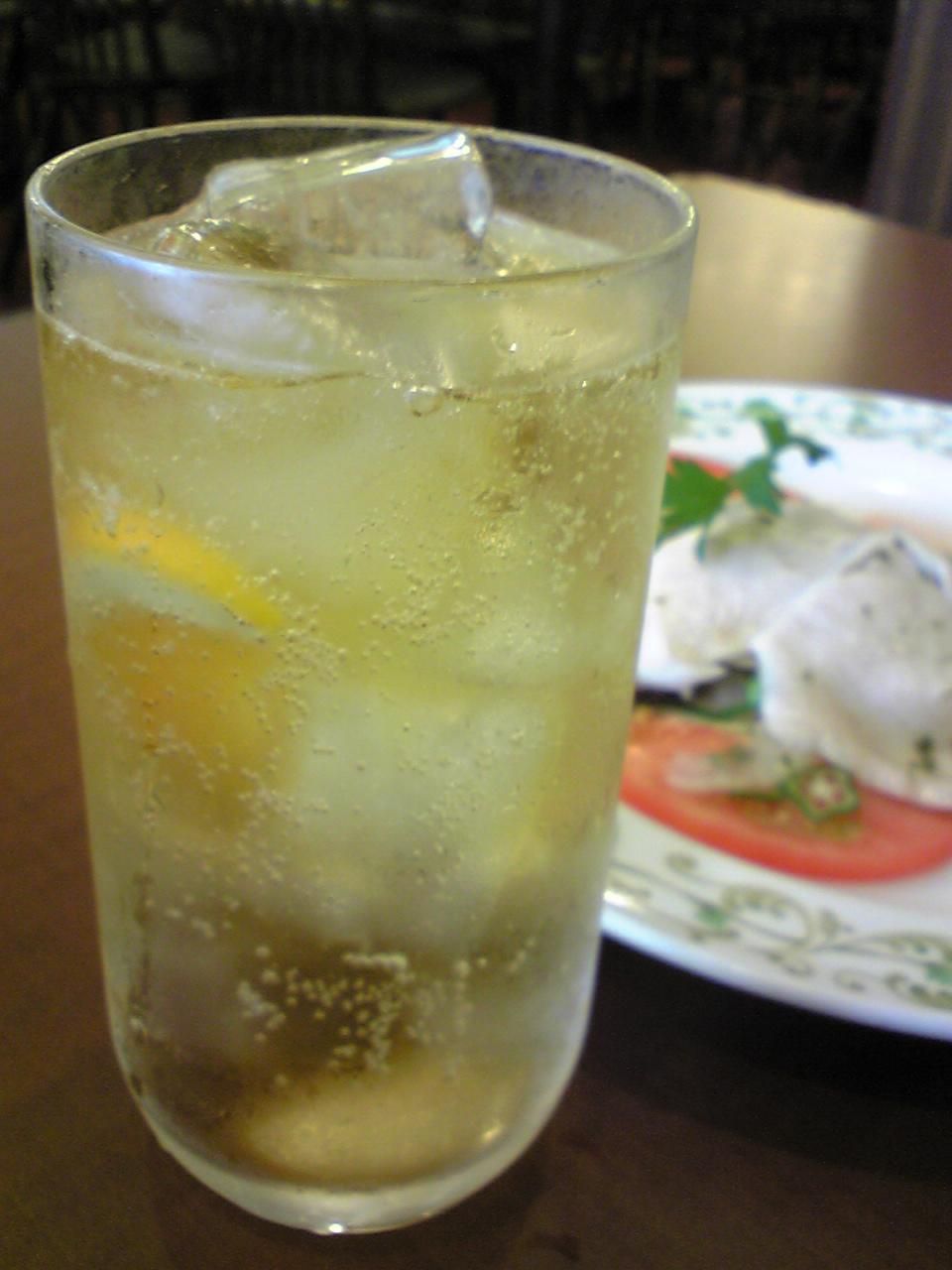 飲むと痺れる…なぞという使い古された冗談はさて置くとして、電気ブランにソーダ、そこにオレンジの切り身を添えた物という説明を聞き、そりゃ美味そうだ、と、注文。