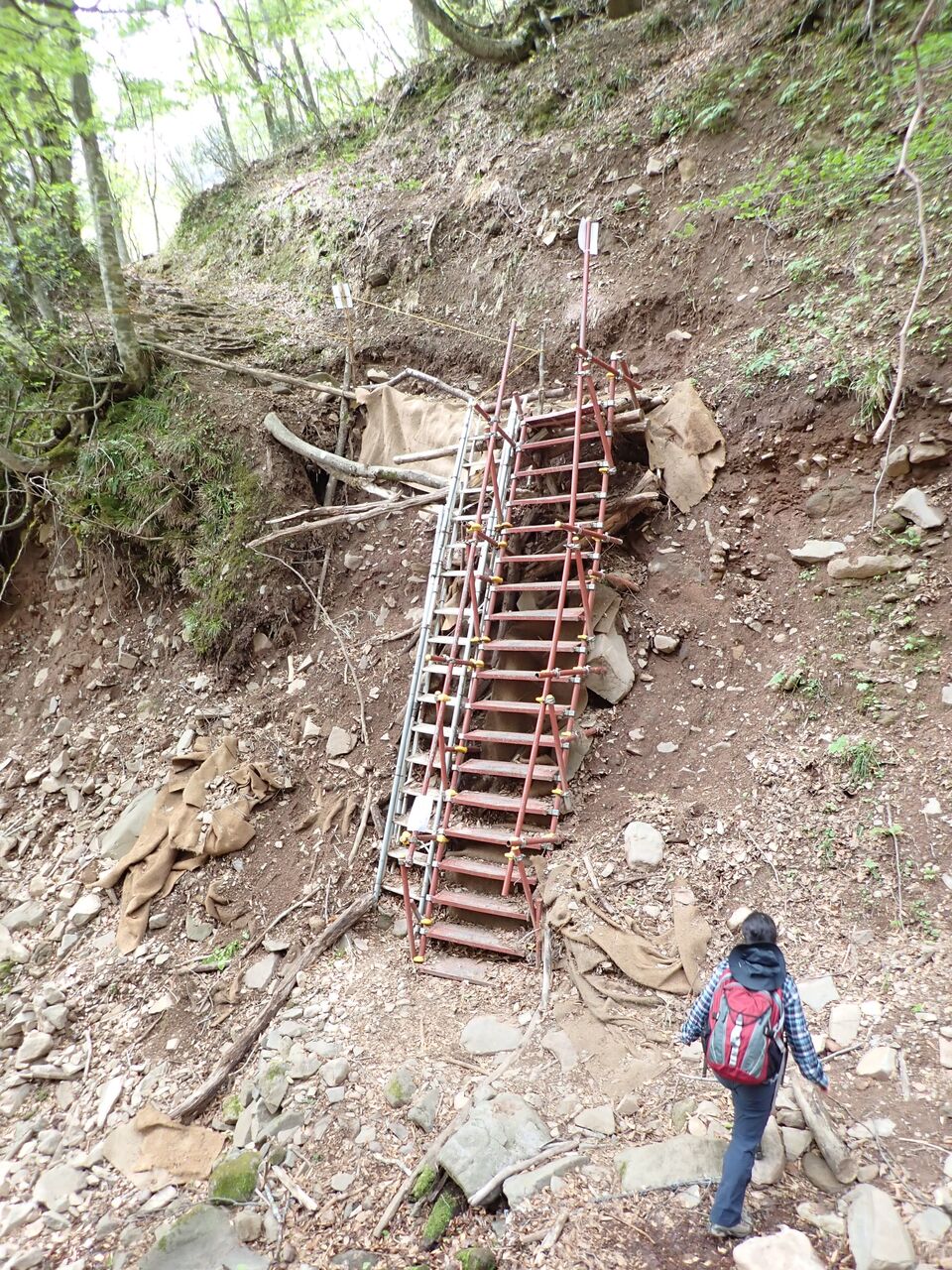 地蔵堂の先は一か所だけ道が崩壊している箇所がある。はしごがかかっているが、少々不安定。大人数で登るとたぶん外れそう。注意書きも一人ずつ使えと記載あり。