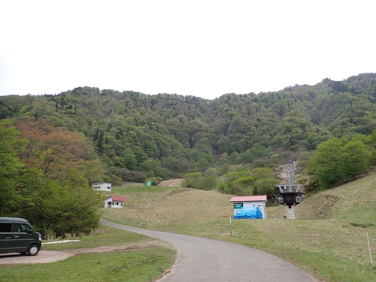 歩いてきた稜線を振り返る。ここには奈良尾(逆水)キャンプ場があるが、数張しか張れず、どちらかというとファミリーキャンプ向け。後ろはスキー場だし、ちょっと俗っぽいので、福定親水公園のほうがお勧め。2張ほど家のようなテントが張ってあった。