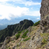 頂上での大展望を楽しんだあと、下山する。文三郎尾根への下山路は山頂からダイレクトに伸びている尾根ではなく、いったん山頂の裏側に回り込み、権現岳への縦走路への途中から分岐する。ちょっとわかりにくいかも。この道もなかなか登りごたえがありそうだ。下から見上げる ...