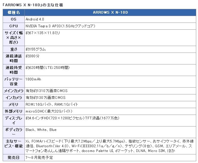 NTTドコモは5月16日、クアッドコアプロセッサを搭載した富士通製の「Xi」対応Androidスマートフォン「ARROWS X F-10D」を発表した。