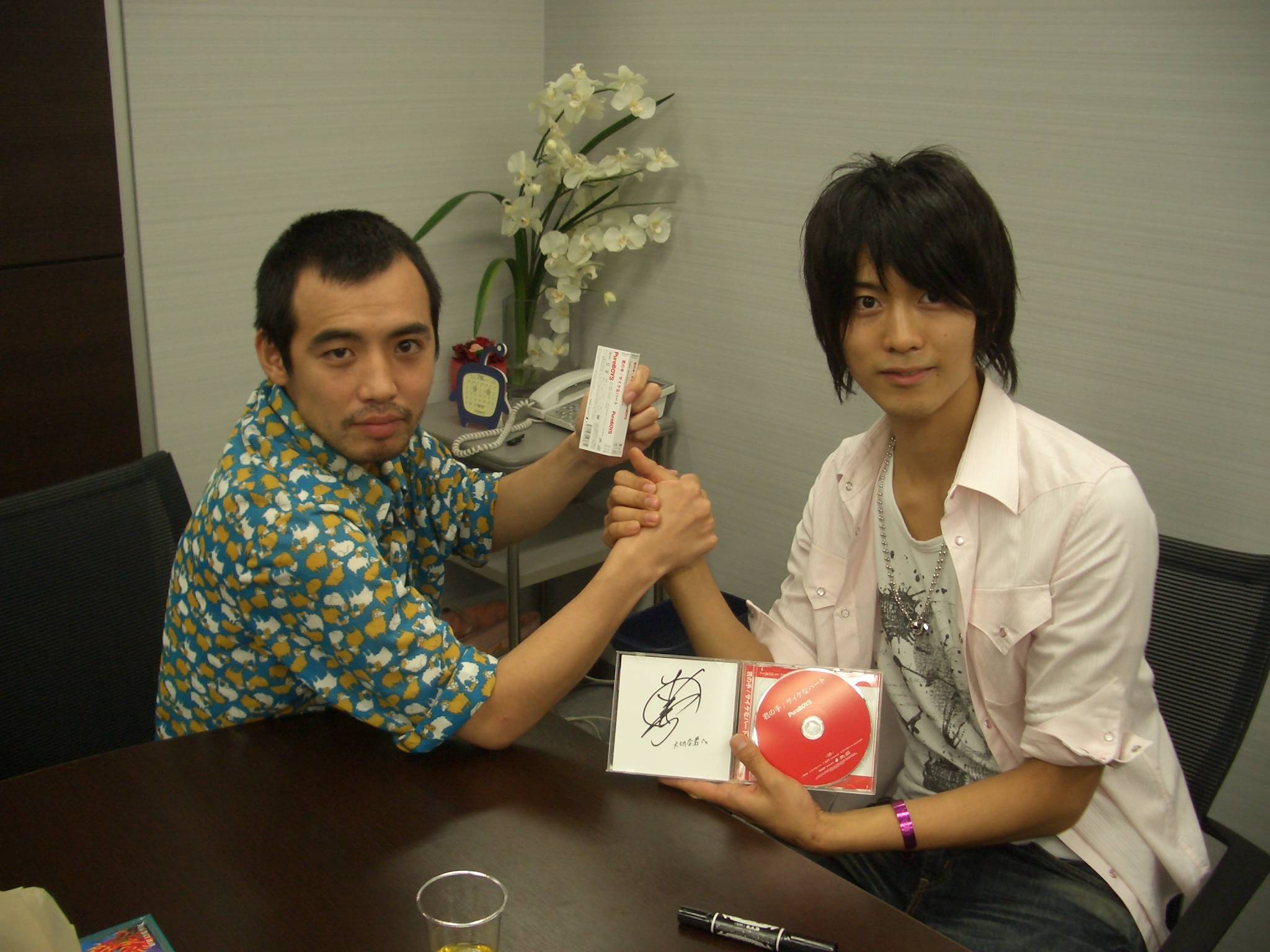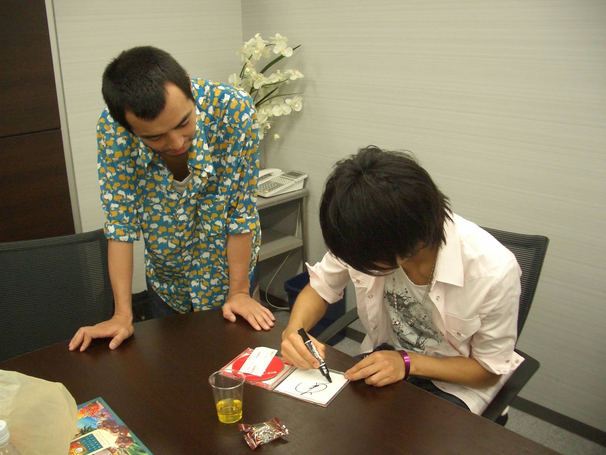 松浦祐也さんの私物CDにサインする南圭介さん。(このCDは明日・水曜日にプレゼントされます。)