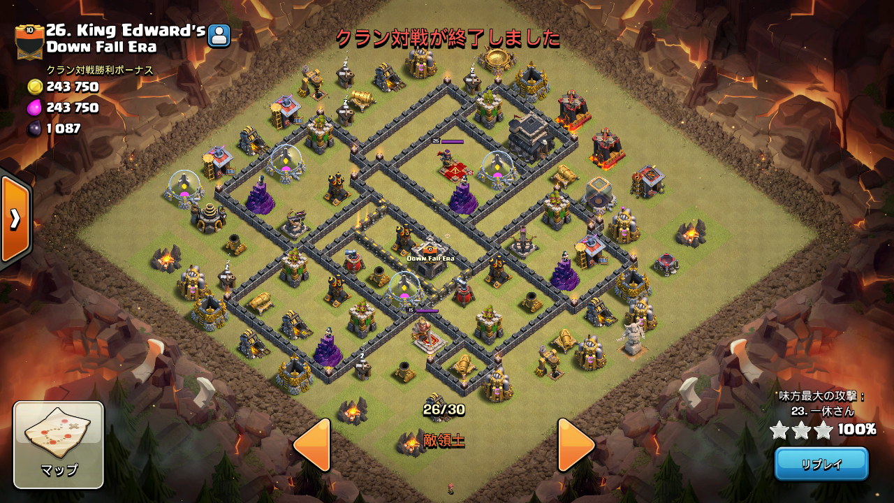 ・村の四隅にキャンプとか置く人いますが、あれ防衛する確率低いので、やらないほうが良いかも。少なくとも僕は一度も時間切れにはなりませんでした。特に後半になると全壊が狙えずパーセント稼ぎ要因になるので、おすすめしないです。