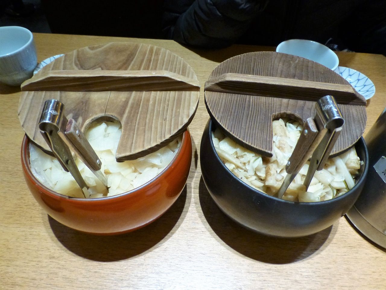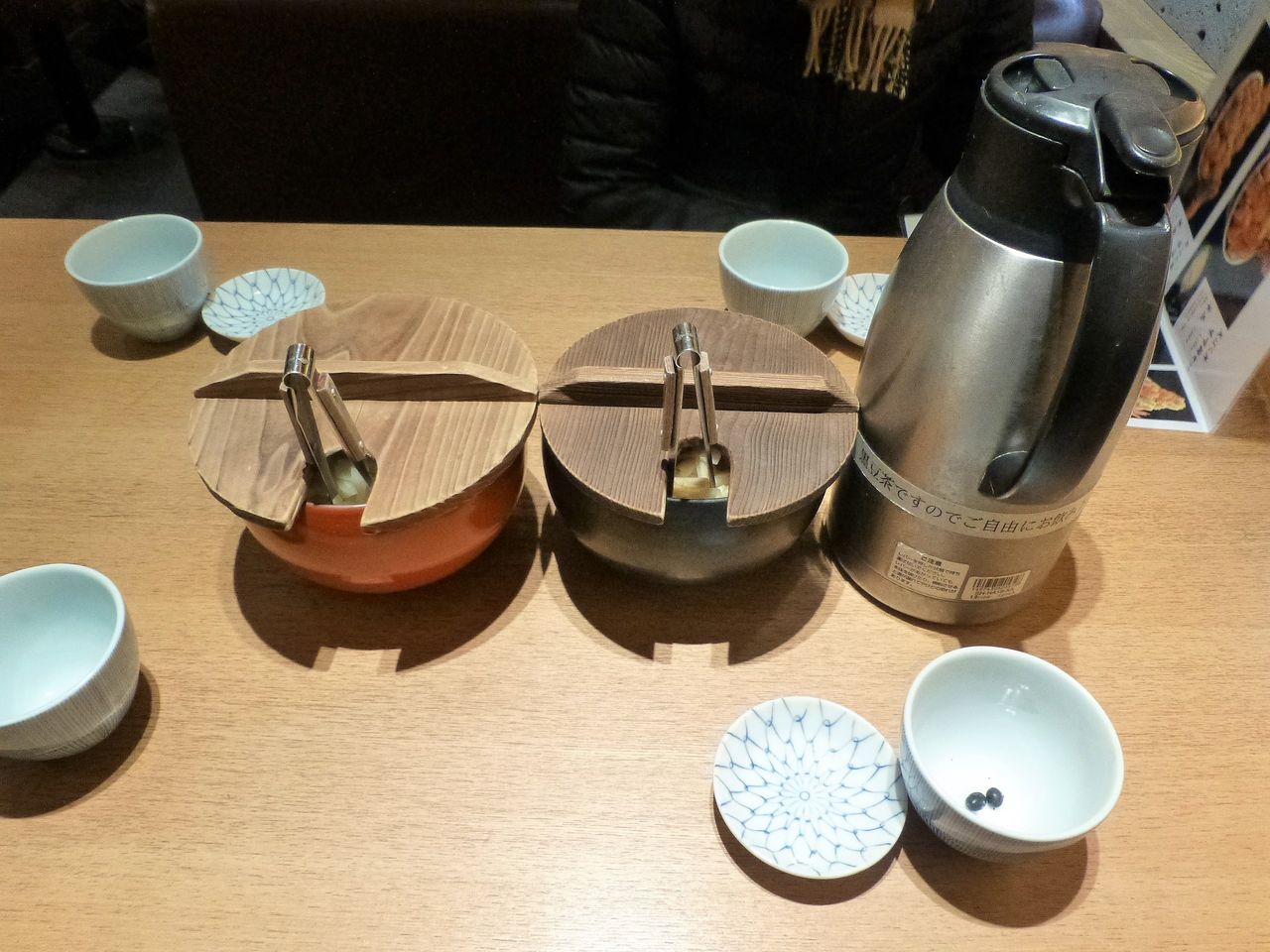 卓上の、がりごぼうと漬物を食べながら待ちます。