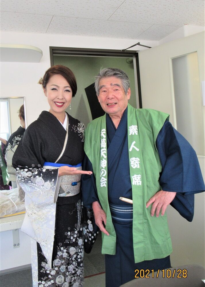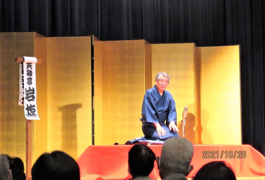 2021年11月02日 老人クラブ長寿大会 橿原市老人クラブ長寿大会落語会橿原市の老人クラブ長寿大会に呼ばれました。橿原市の市長や市議会の議長による表彰式の後、三味線&踊り、腹話術の後落語3席を行い、プロの歌手奥村ゆかのステージを行いました。 岩塩『火焔太鼓』 奥村ゆかさんと