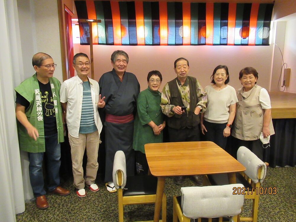 2021年10月08日 古々粋亭寄席 古々粋亭天満天神寄席(第8回)奈良県みんなで楽しむ大芸術祭の参加イベントとして久々に落語会を実施しました。 今回は 八軒家裕次郎「浮世根問」 天神亭蝶九「親子酒」 天満家芝楽「木津の勘助」八軒家たし歌「めざせ甲子園」 天神亭岩塩「抜け雀」 の5名で一座を組みました。 裕次郎 蝶九 芝楽 たし歌 岩塩 集合 久々の落語会、足は痺れる、出来は今一、セリフは噛むでも楽しくやれました。