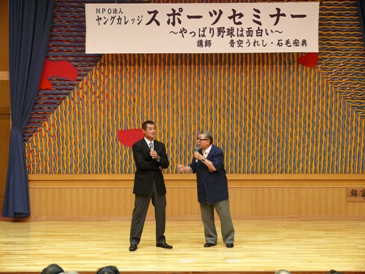 今日はヤングカレッジのスポーツセミナーで、漫才の青空うれし師匠http://www18.ocn.ne.jp/~u4a/と、元西武ライオンズの選手で現在全国に野球の独立リーグを発足させる為に奔走している石毛宏典さんhttp://www.h-ishige.com/に来てもらった。