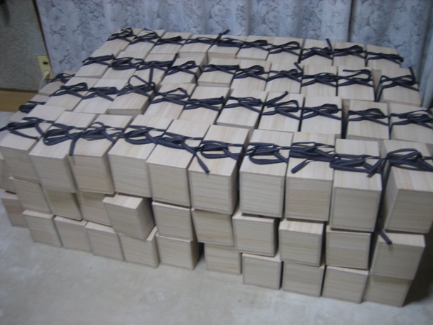 窯焚きが終わればまだまだ仕事が待っている。二個づつ百数十組を桐箱に入れ、包装しなければいけない。おっとその前に全部の箱に筆で箱書きをするんだ。そして朱印を押す。これが結構重労働なんだよ。