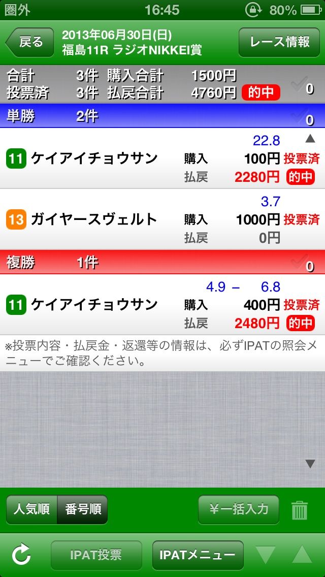 ケイアイチョウサンを対抗にして単複ゲット。単勝の掛け金が少ないのは少し恥ずかしいですね。笑