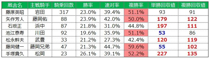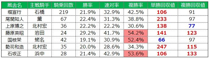 また騎乗数は少ないのですが、騎乗した際は好走をする厩舎が多くあります。