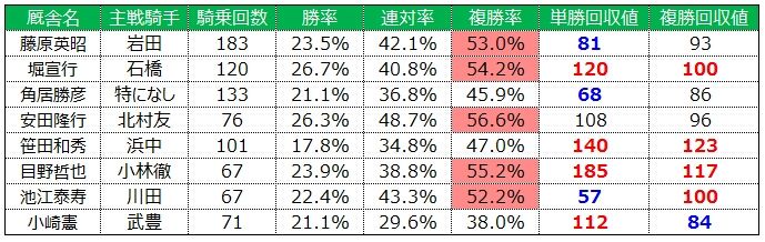 以上、リーディング上位3人の好走傾向の高い厩舎との組み合わせをご紹介いたしました。