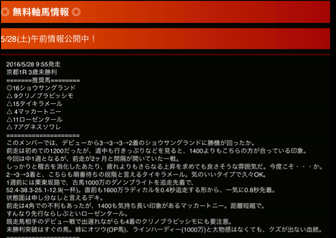 このサイトに無料登録をすると毎週土日に無料情報のレース予想を見ることができます。そしてこの予想が驚くほど当たります!