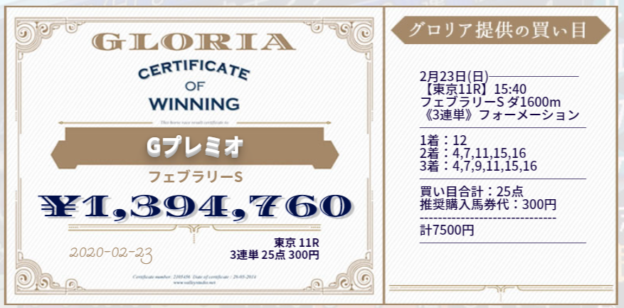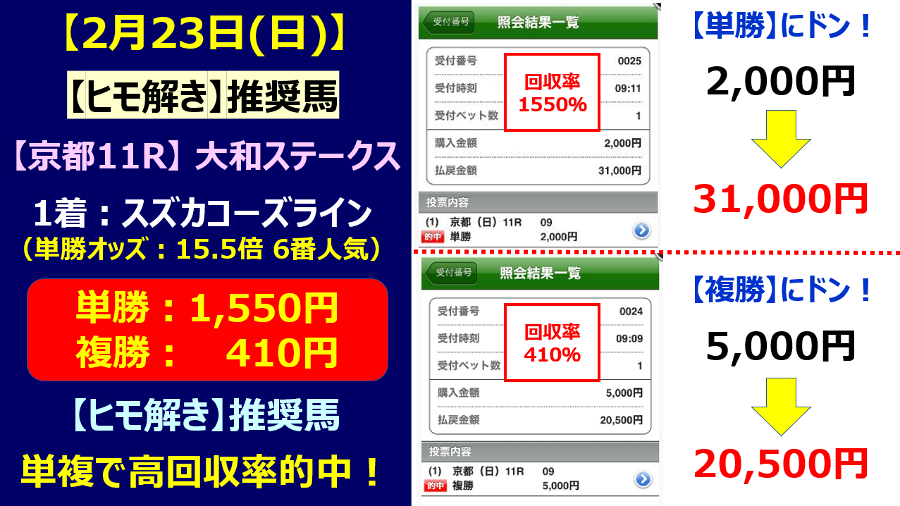 さらに上記以外でも先週の2月22日(土)~2月23日(日)には凄い払い戻しの予想が提供されておりました!