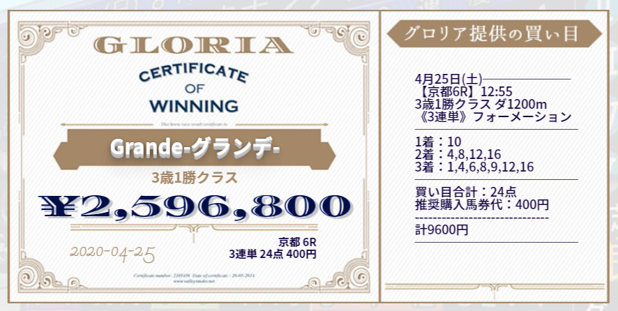 このように高配当馬券が毎週のように的中する新サイト『GLORIA』のご紹介です。