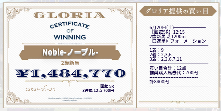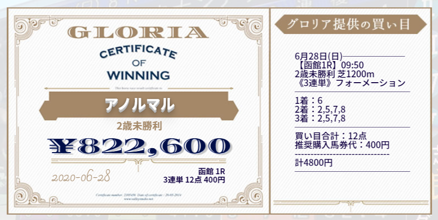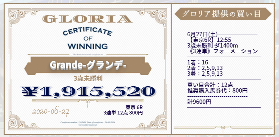 このように高配当馬券が毎週のように的中する新サイト『GLORIA』のご紹介です。