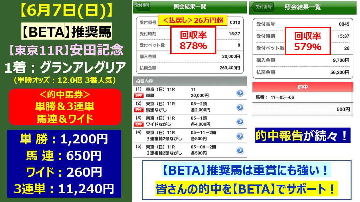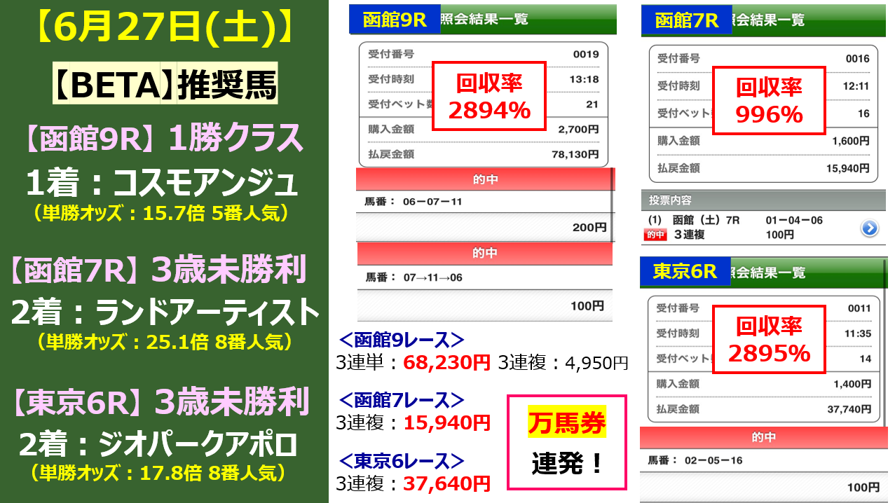 さらに上記以外でも6月27日(土)~6月28日(日)では払い戻し額が凄い予想が提供されておりました!