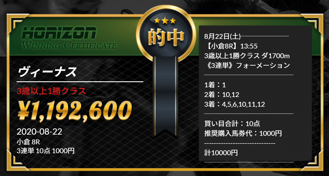 このように高配当馬券が毎週のように的中する新サイト『HORIZON』のご紹介です。