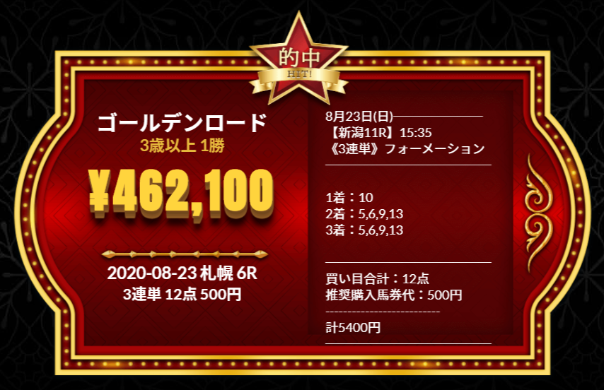 さらに上記以外でも8月22日(土)~8月23日(日)では払い戻し額が凄い予想が提供されておりました!