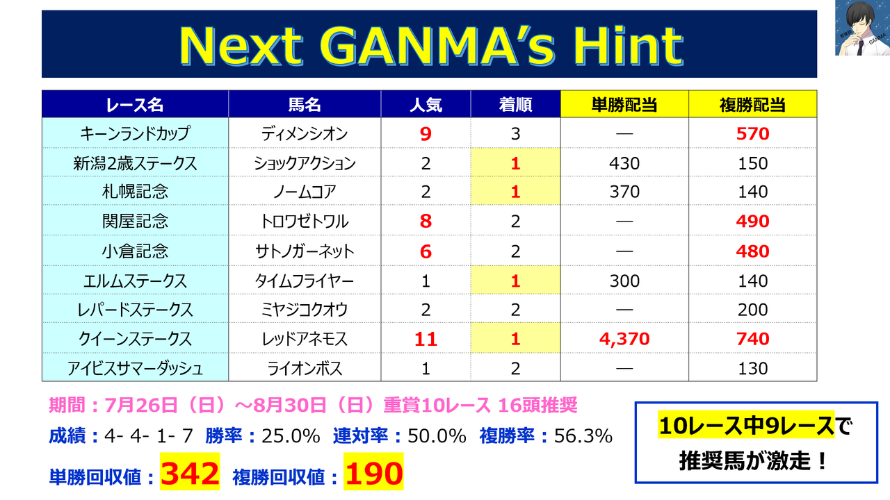 直近10レースで9レースも推奨馬が馬券になっております。来週もご期待ください!