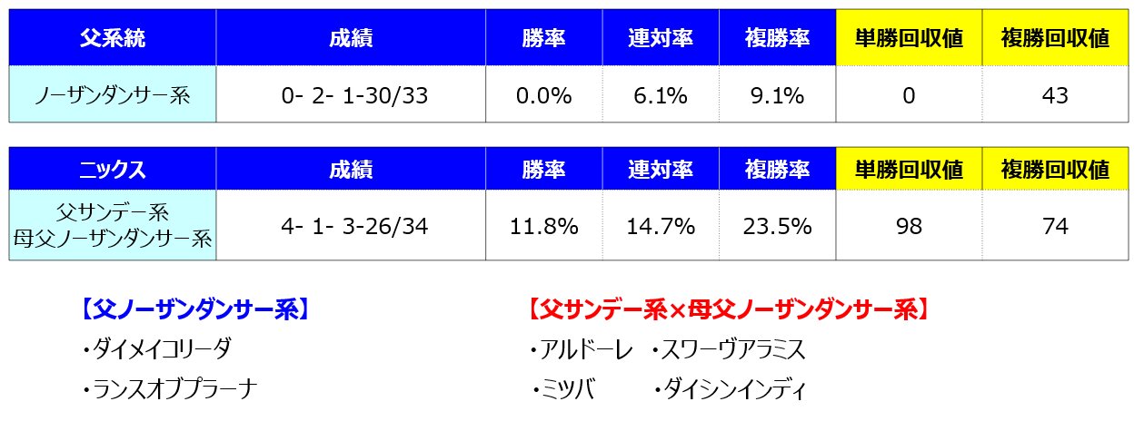 ニックスで見ると父サンデー系×母父ノーザンダンサー系が面白いようです。