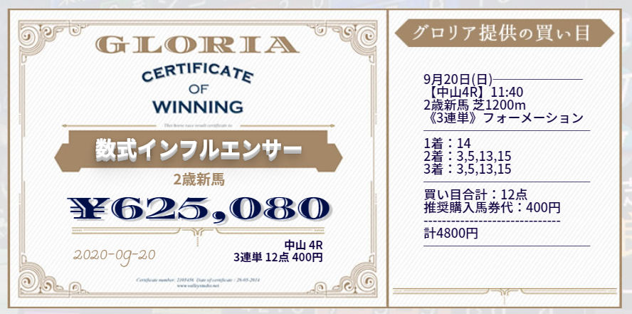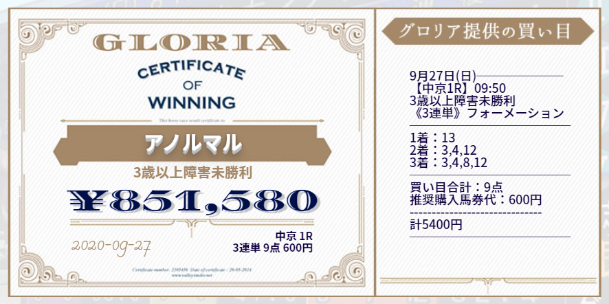 このように高配当馬券が毎週のように的中する新サイト『GLORIA』のご紹介です。
