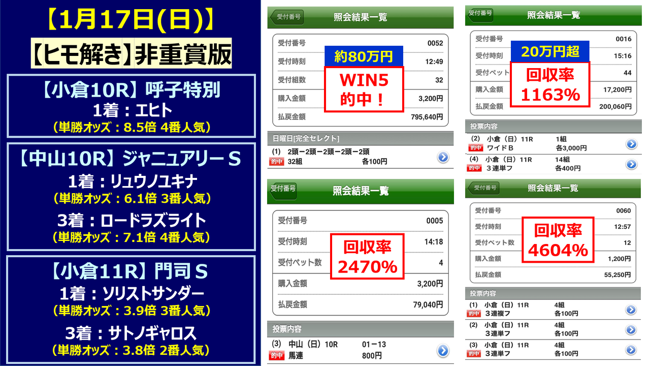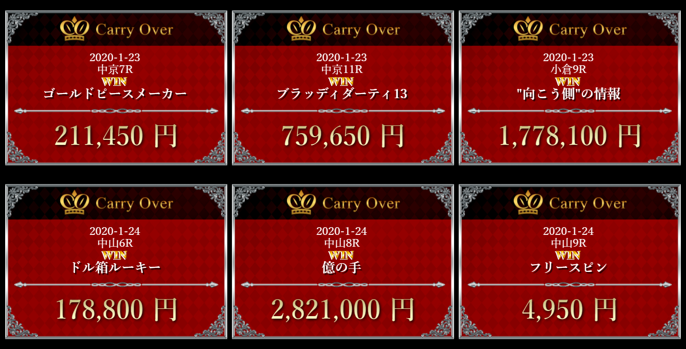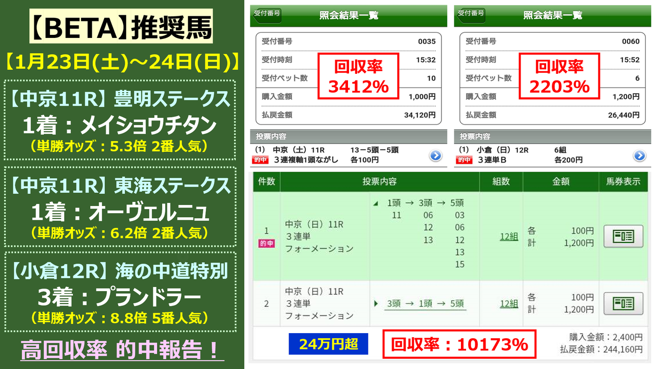 さらに上記以外でも1月23日(土)~1月24日(日)では払い戻し額が凄い予想が提供されておりました!
