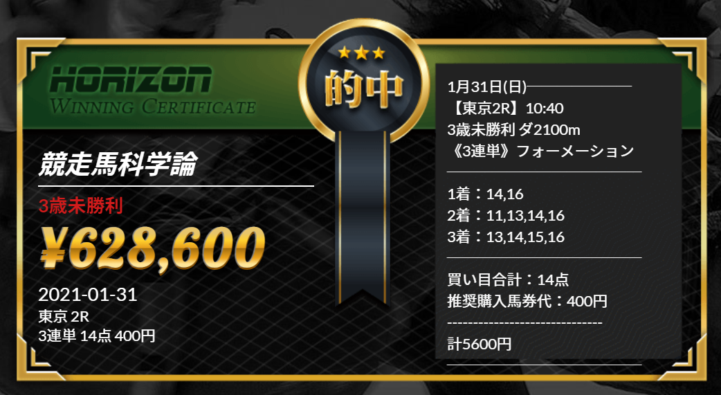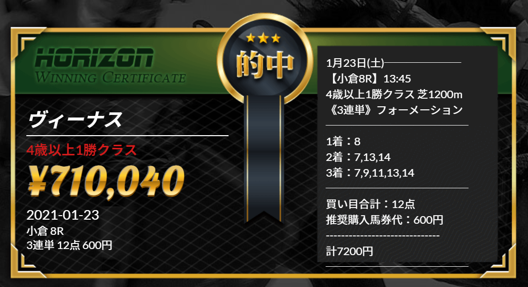 このように高配当馬券が毎週のように的中する新サイト『HORIZON』のご紹介です。