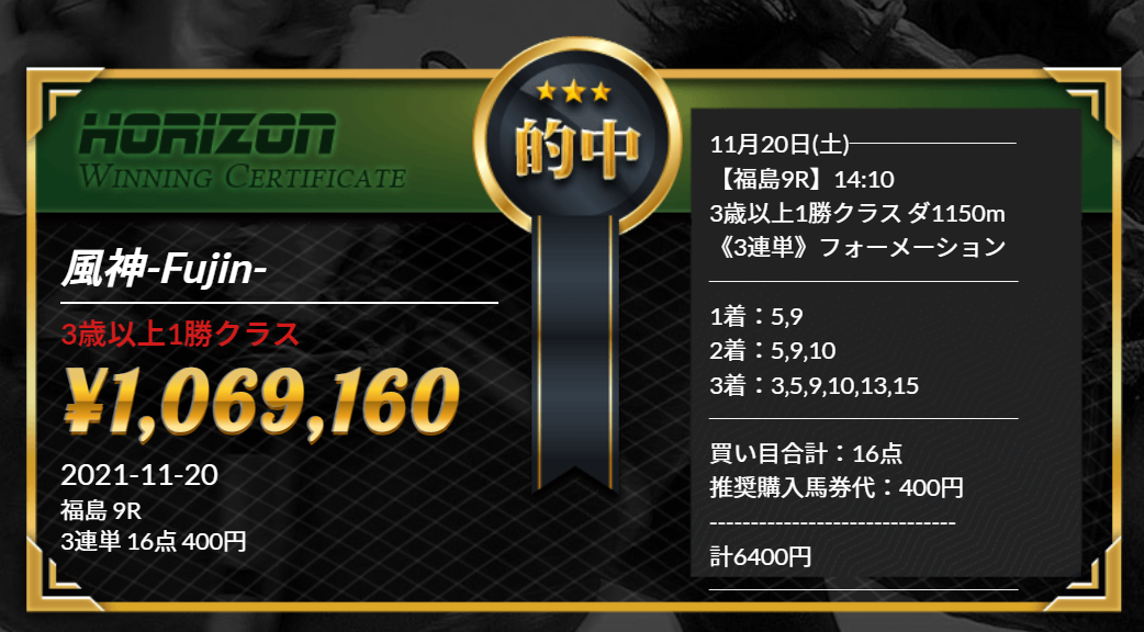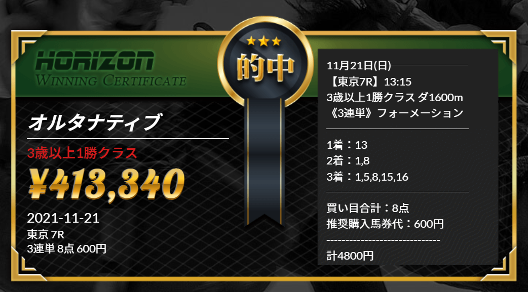 このように高配当馬券が毎週のように的中する新サイト『HORIZON』のご紹介です。