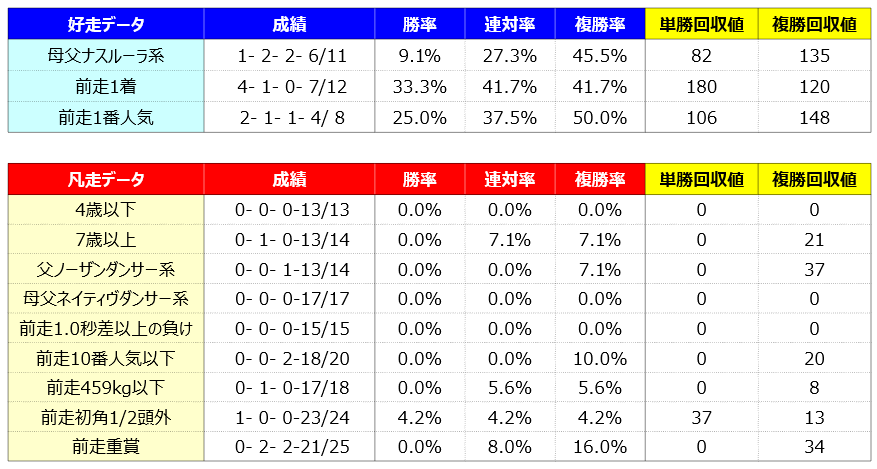 ストライクゾーンが狭いタイプなので、好走する時は好走できるかもしれませんが、惨敗する時は惨敗するでしょうね。シンプルに重賞では通用しないという可能性はありそうです。