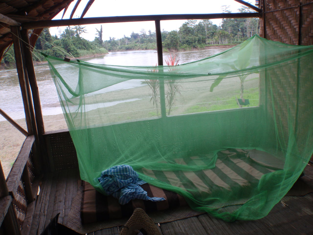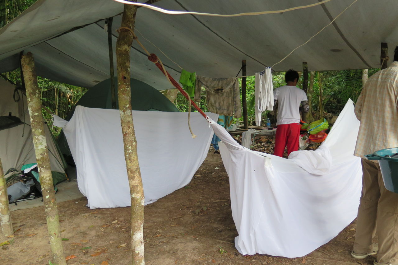内部にはエアマットが装備、少し下がってタープの下に小ぶりのテントとハンモック、野性味あふれるガイアナキャンプ生活の始まりです!!