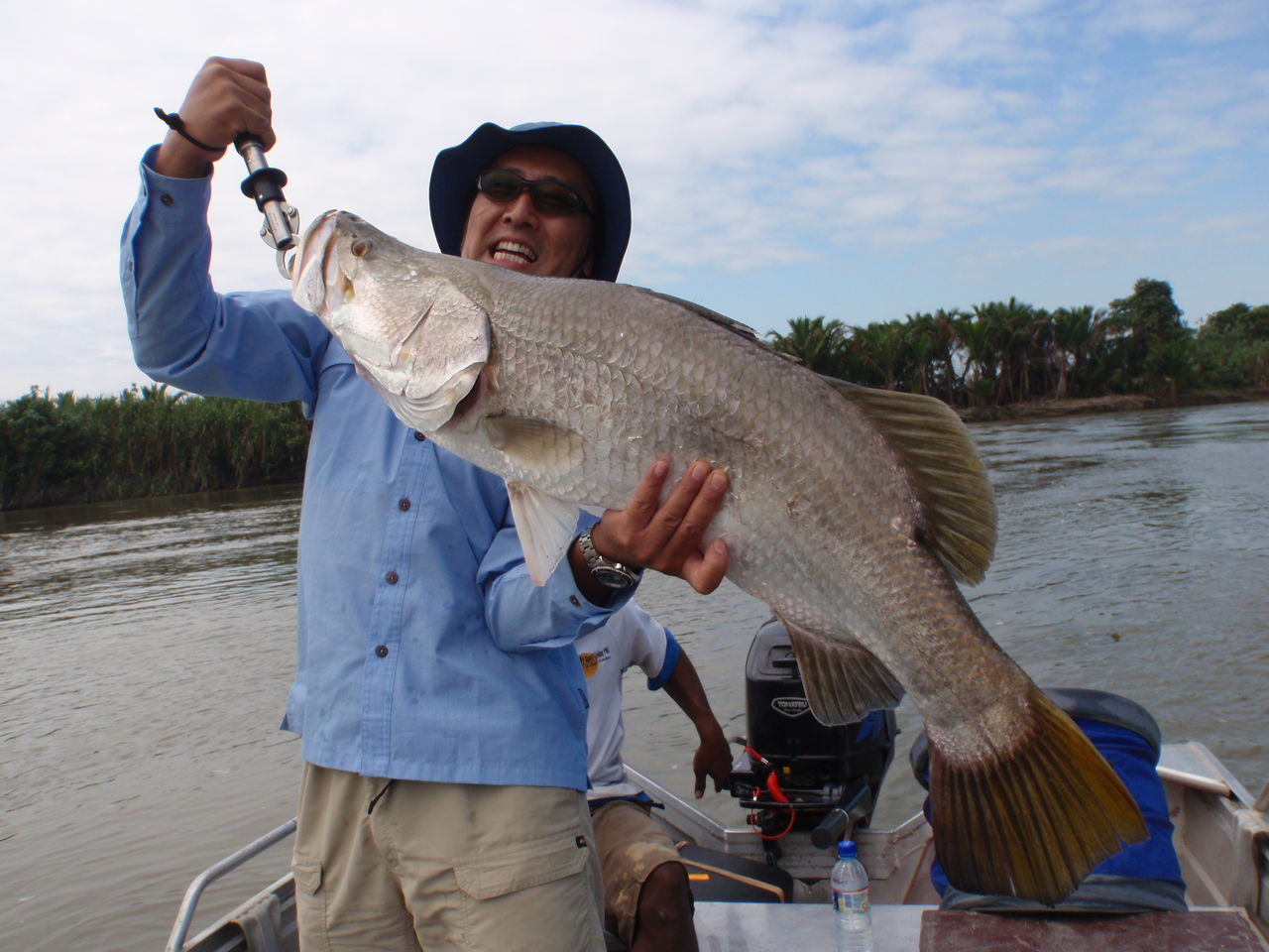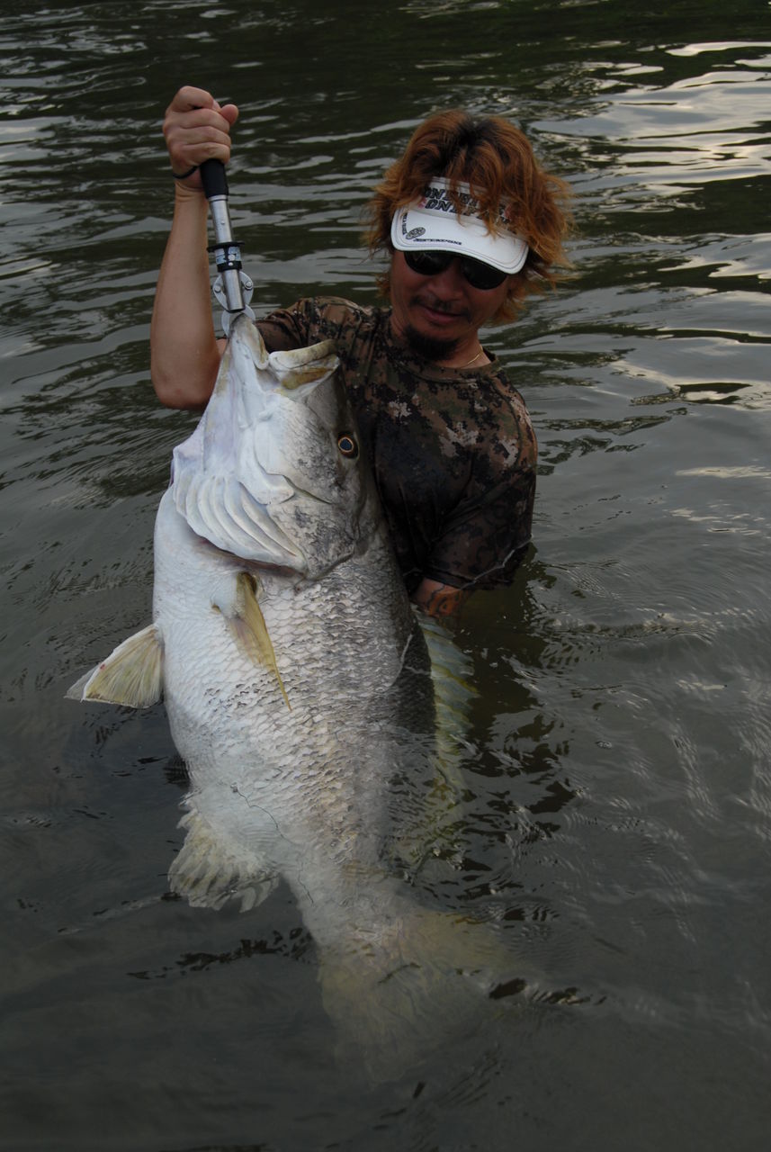 初日、河口域でのバラマンディーは不発に終わったが、2日目、上流キャンプ地へ向かう途中の有名ポイント、今回の地元コーディネイターJASON氏の名がついた「JASONクリーク」にて待望のバラマンディーに出会えた!!