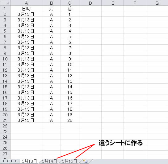 そのため、曜日ごとや席種ごとにシートを作った方が、管理する上では便利ですが、ナンバリングデータは、上から順に流し込まれますので、別のシートのデータにリンクすることはできません。